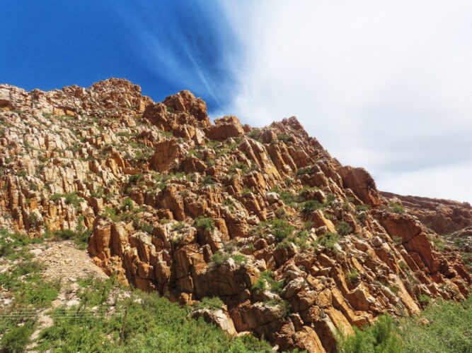 De Rust is the gateway to and from the Groot (Great) Karoo. You have to cross the Swartberg, the highest mountain range in the Western Cape, to get to the Groot Karoo. There are two ways to do it, and I recommend both. You can gently wind through Meiringspoort, a 25km gorge, to the other side. It has some of the best-kept picnic spots in South Africa, an excellent tar road, stunning sandstone cliffs, crystal-clear mountain streams and a wealth of endemic vegetation.