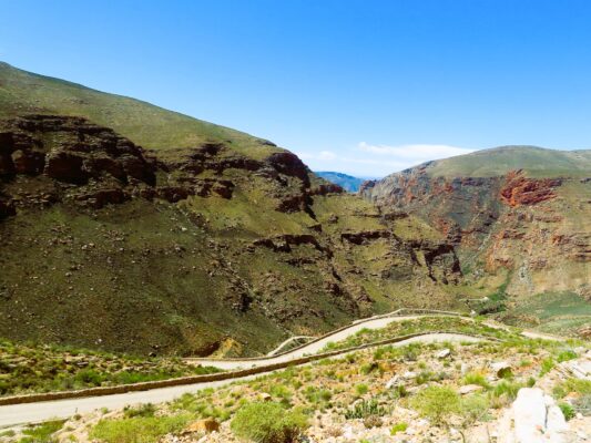The crazier way is to take the dirt road close to Oudtshoorn and go over the top, through the 23.8km Swartberg Pass. Thomas Bain built the road in the 1880s, and today it’s a decent gravel road with much of the original stonework intact.