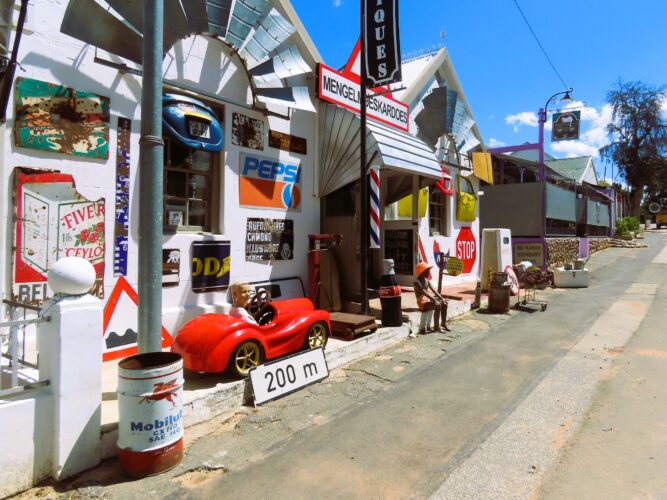 From the hotel, wander along the main road. We stopped at Pluim for lunch. It has fabulous vegan burgers and a gourmet brinjal sandwich, which you can feast on among great art. Up and down the street, find Café De Rust (highly rated by locals), the Grumpy Goat (a bar), Mengelmoeskardoes (an all-sorts vintage shop with old-time sweeties), the Rusty Nail (another bar) and Karoo Rouge (stockists of all kinds of “veldskoen”). There’s more than what I’ve listed, of course.