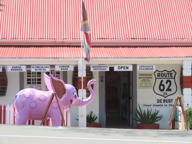 The little wine shop in De Rust, known as the “pink elephant”, stocks a range of Klein Karoo wines, as well as olive products and cheese.