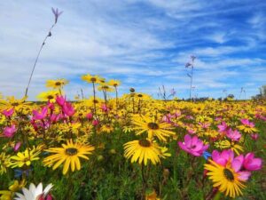 I know: it looks so inviting. But if you lie in the big beds of flowers or stomp over them, not only will you likely kill off that patch, you could also have a nasty surprise. There are snakes! They come out in the warmth that the daisies love. I do not tell a lie.